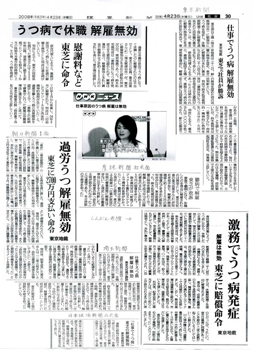 長時間労働でうつ病 東芝の解雇「無効」 「激務でうつ病」認め解雇無効 東京地裁判決