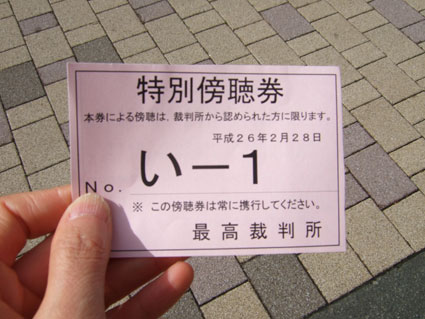 私の傍聴券です。原告なので特別傍聴券ですが、一般の人は「傍聴券」とだけ書いてあります。