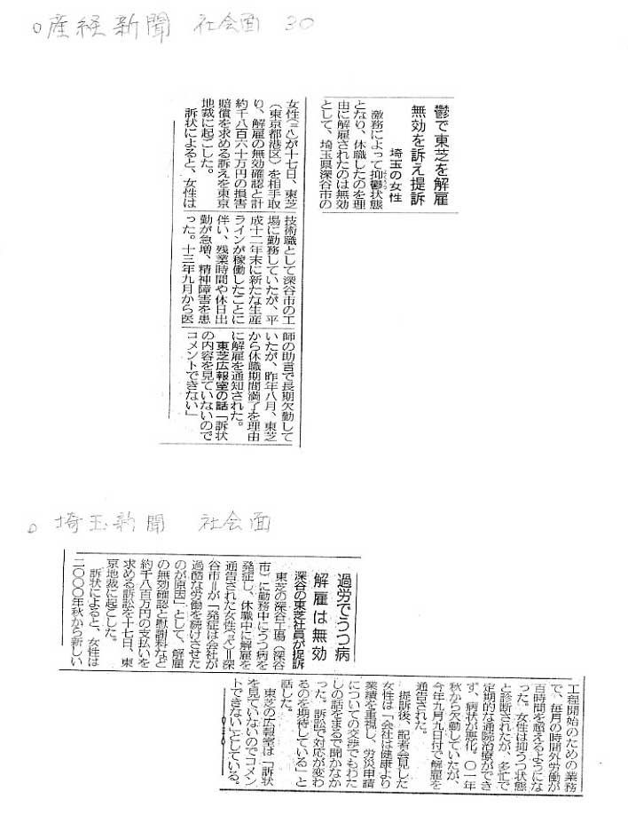 東芝・過労うつ病労災・解雇裁判 > マスコミ報道 産経新聞 2004年11月18日 朝刊 鬱で東芝を解雇 無効を訴え東芝を提訴 埼玉新聞 2004年11月18日 朝刊 過労でうつ病 解雇は無効 深谷の東芝社員が提訴