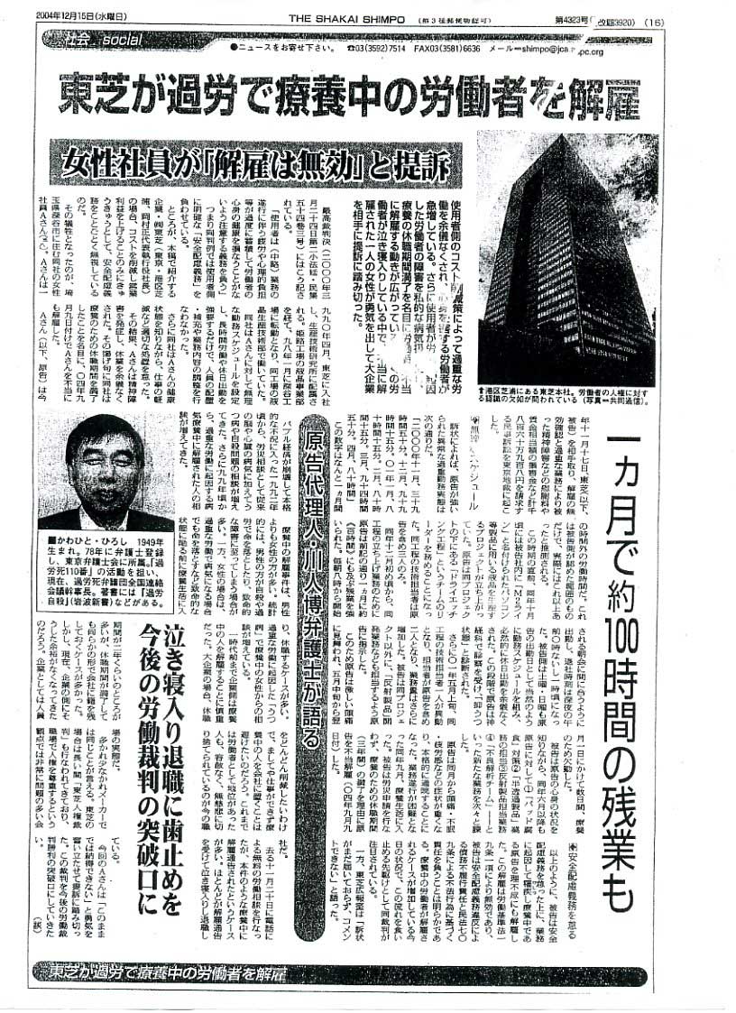 社会新報 2004年12月15日 東芝が過労で療養中の労働者を解雇 女性社員が「解雇は無効」と提訴