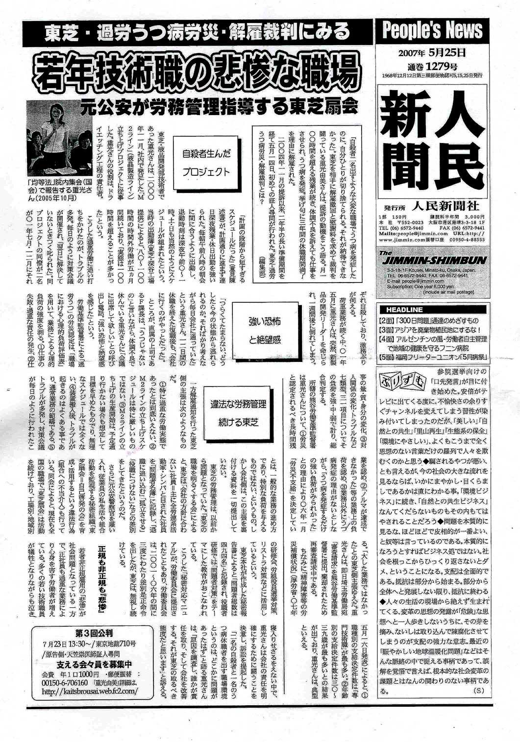 人民新聞 2007年5月25日 東芝・過労うつ病労災・解雇裁判に見る 若年技術者の悲惨な職場